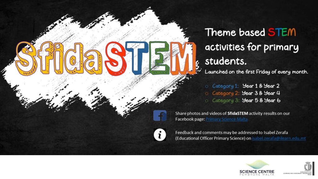 SfidaSTEM activities will be launched on the Facebook page Primary Science Malta on the first Friday of every month. This initiative targets three different categories, namely: