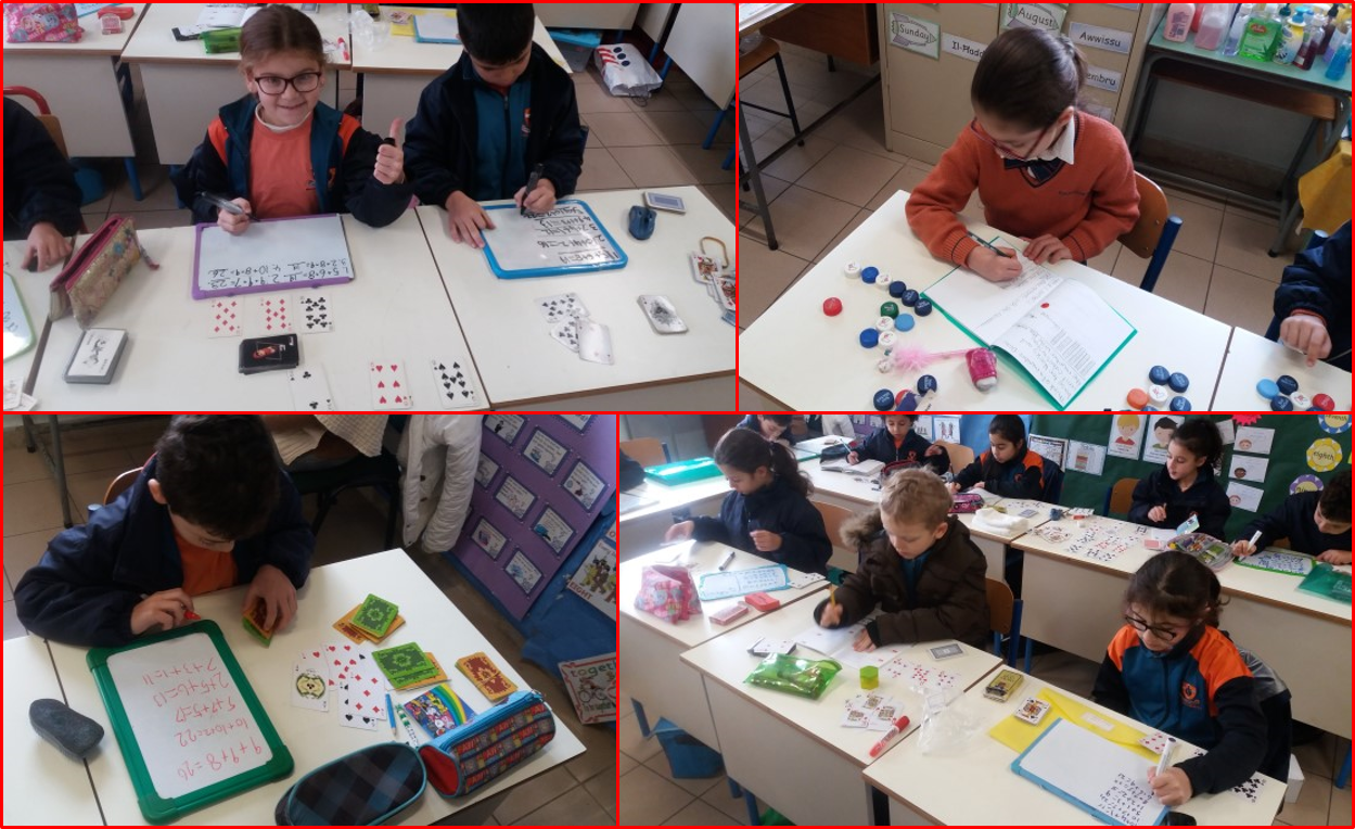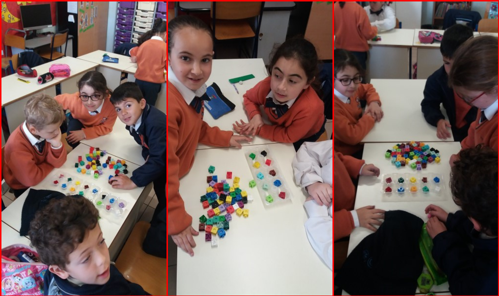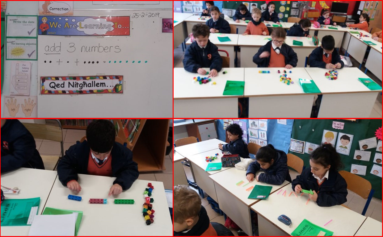 Yr 3.1 students learning how to add three numbers. First, they participated in investigations where they made different amounts with cubes, straws and caps. Then, the students drew shapes as pictorial representations of three different amounts and counted the total. Finally, they moved on to numerical representations of addition sums by means of a game with playing cards.