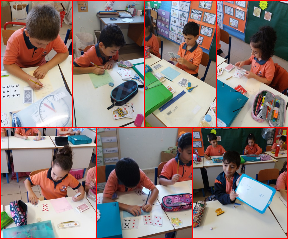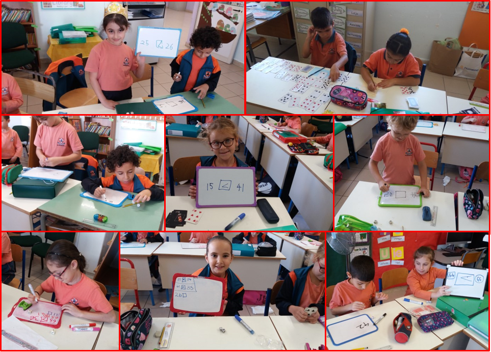 In the photos the year 3.1 students are seen participating in two different activities involving creating 1-digit and 2-digit numbers with dice and later with playing cards. They created different amounts and types of numbers, according to their abilities, and then, they compared the numbers they created by using the symbols <, > or =.