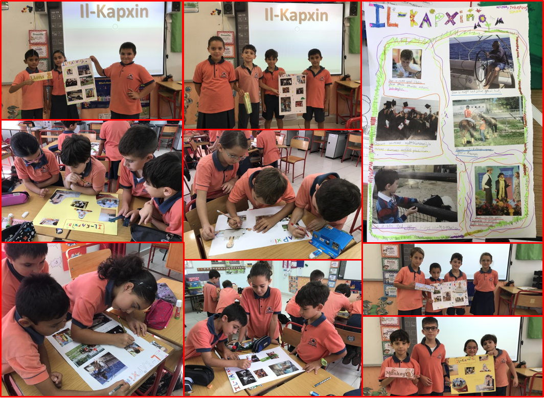 During a Maltese writing lesson, the children had to cut out pictures from magazines, glue them onto a chart and then write a caption about each picture. Finally, they shared their work as a group to their classmates.