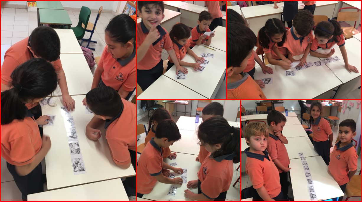 The Year 3.2 students were divided in groups. Each group was given a set of picture cards of the story The Lion and the Mouse. Students had to put them in the order they think was right. Students displayed the cards on the table. Then, students listened to the story and checked if their cards were in the correct order. Students listened to the story again and a worksheet was given to them. Pupils had to fill in the table (integrated with a Math lesson) by ticking under the correct heading. Finally, in groups, students narrated the story (picture cards were used as prompts).