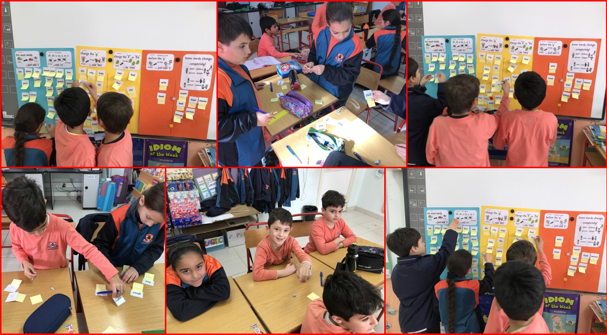 Students have been learning the plural of several nouns. Indeed, during one week they learned that nouns ending in ‘y’ can be tricky; some drop the ‘y’ and add ‘ies’ while others add only an ‘s’ after the ‘y’. To rehearse what they had been learning students were divided in groups. One activity was a board game. After throwing the dice, students had to pick the correct card number, read the sentence and change the noun in brackets into the plural. Students wrote their answers on their mini whiteboards. For the other activity students had to use the Bee-Bot. Students chose and read one flashcard (a singular noun ending in ‘y’) at a time. Then, they had to program the Bee-Bot properly so that it would stop on the correct plural of the given word.