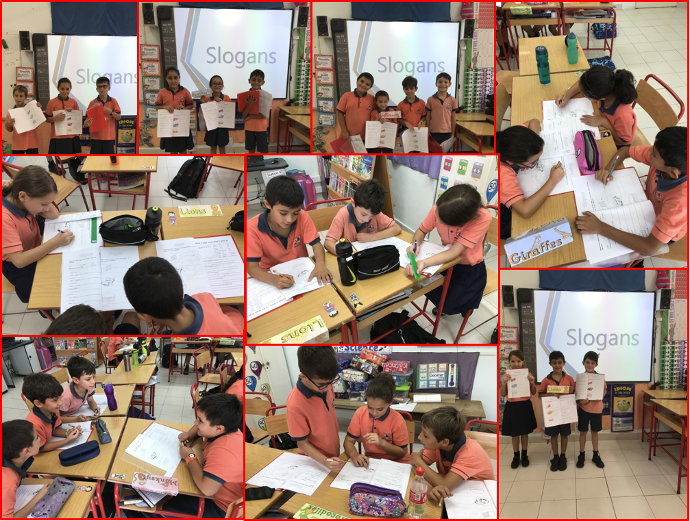 During a Maltese writing lesson children were put in groups to create a slogan for new careers. They had to colour and finally share their slogans with their classmates.